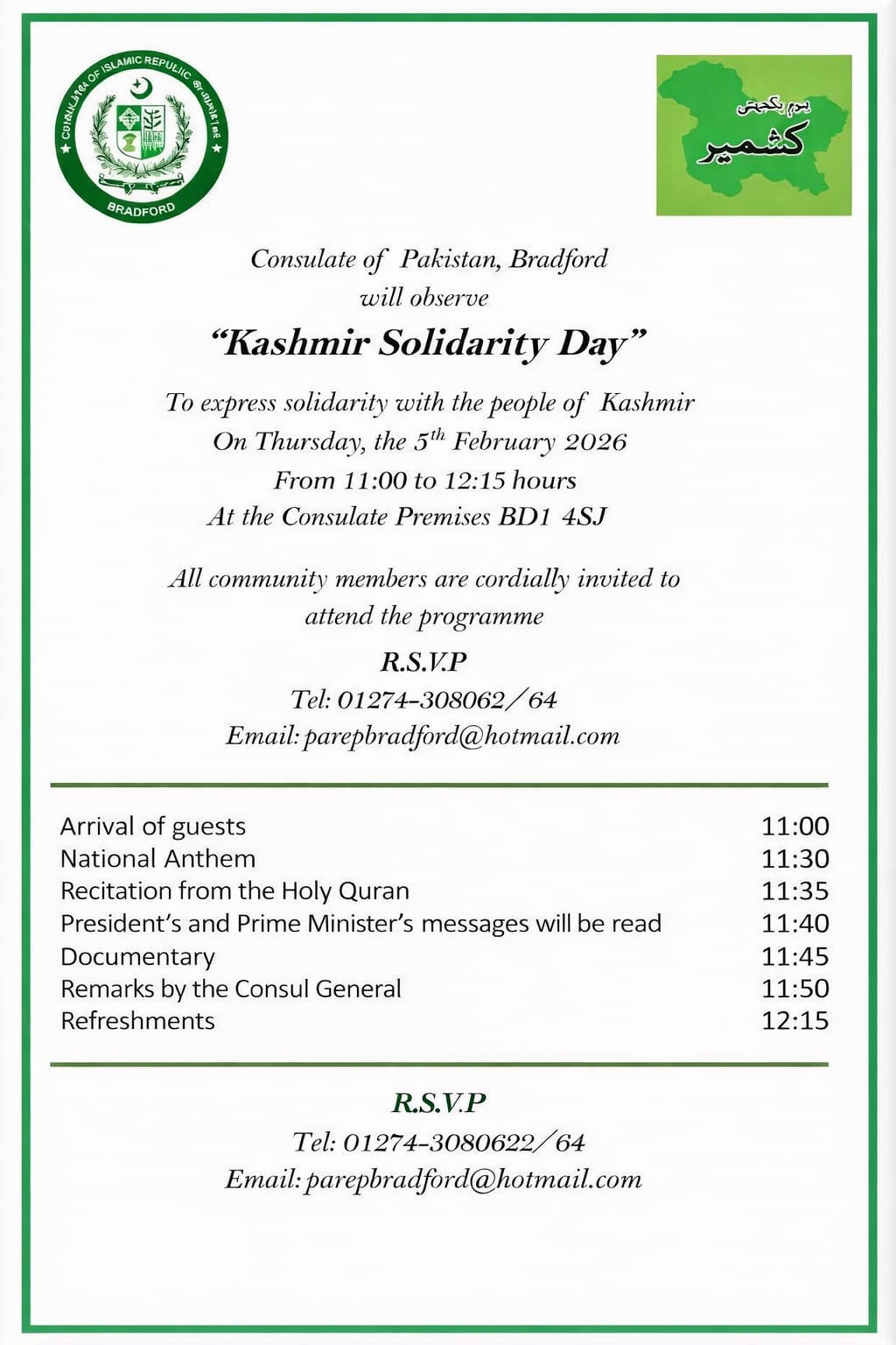 The month of February, 2026 the Consulate of Pakistan Bradford team will visit following cities to provide Consular services (Nadra Card/FRC /POC and Attestation of Power of Attorney, Affidavit etc) to the community as per the following schedule. The appointment booked for the Surgery date and day will entertained at following address / location, not repeat Not at Bradford Consulate.